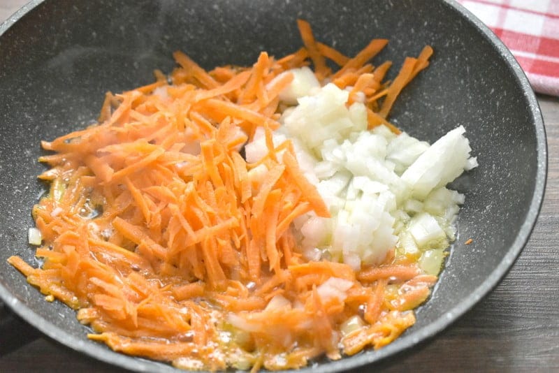 Очищаем лук и морковку. Лук нарезаем кусочками, а морковь крупно натираем. Заготовку из овощей перекладываем на сковороду, в которой разогрето растительное масло. Перемешиваем и обжариваем 5-6 минут.