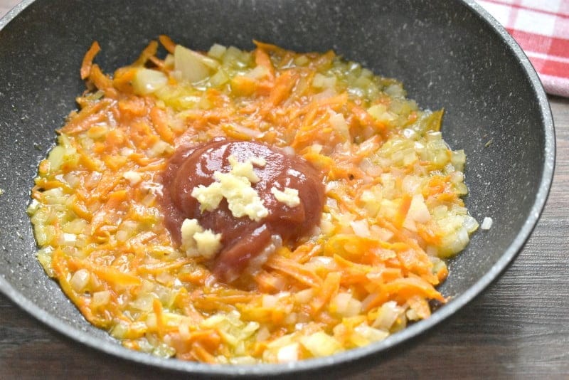 Когда овощи станут мягкими, выкладываем к ним томатный соус и измельчённый зубчик чеснока. Вливаем 2-3 столовые ложки бульона, в котором варится картошка и капуста. Перемешиваем, тушим 5-7 минут.