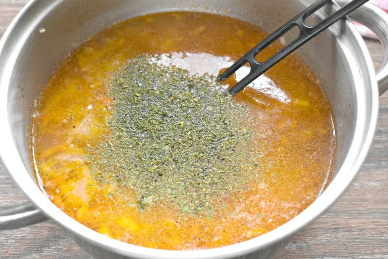 В конце приготовления щи из свежей капусты с томатным соусом приправляем молотыми специями и зеленью (используется сушёная зелень, можно замороженную или свежую).