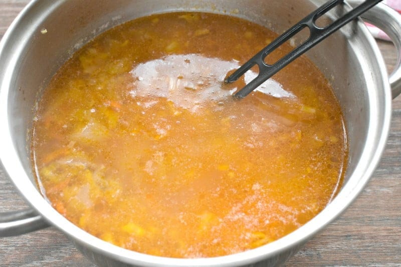 Содержимое со сковороды перекладываем в кастрюлю к картошке и капусте, когда они проварились уже 20 минут, перемешиваем, варим следующие 10 минут.