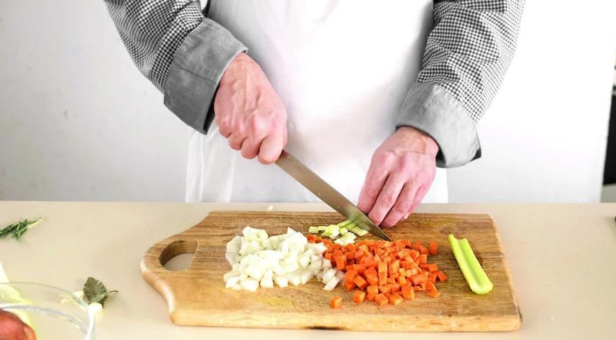Очистите лук и морковь и нарежьте средними кубиками. Так же нарежьте сельдерей. Чеснок измельчите.