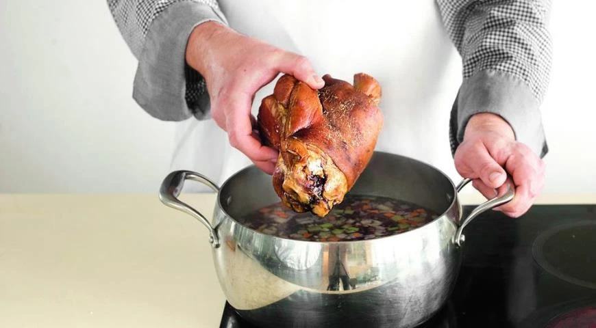 Верните кастрюлю на сильный огонь, доведите до кипения и добавьте рульку, морковь, сельдерей, лук, чеснок и лавровый лист.