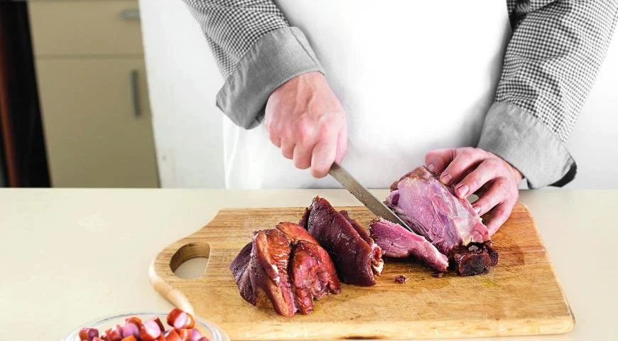 Нарежьте охотничьи колбаски кружочками. С рульки срежьте кожу и жир, мясо нарежьте кубиками. Мелко порубите листочки розмарина.