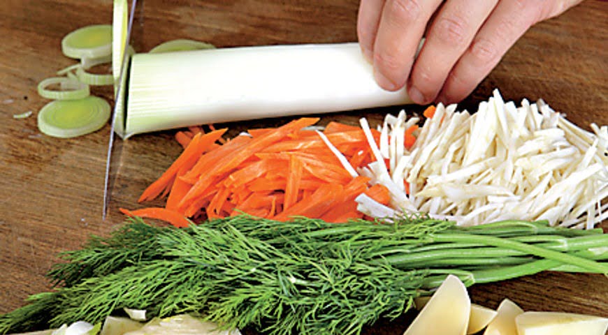 Морковь и сельдерей очистите, порежьте тонкой соломкой. Картофель очистите и разрежьте на четвертинки. Фенхель очистите от поврежденных верхних листьев, мякоть порежьте тонкими ломтиками. Лук-порей нарежьте тонкими кольцами, промойте и обсушите.