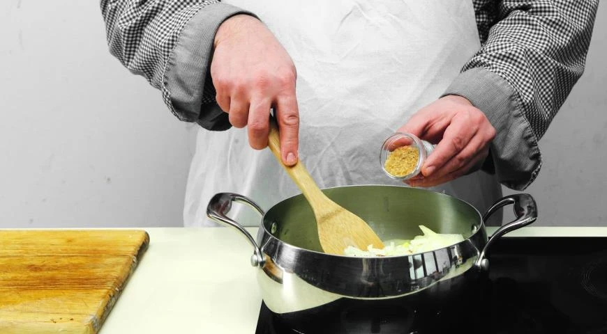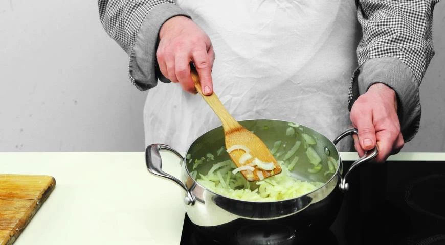 Поставьте кастрюлю с луком на средний огонь и обжаривайте его до золотистого цвета, время от времени перемешивая. На это уйдет около 10 мин. Следите, чтобы лук для супа не подгорал!