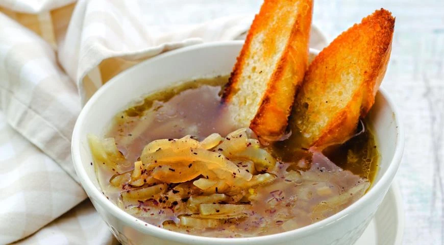 Пока суп варится, обжарьте кусочки багета в оливковом масле с обеих сторон до золотистой корочки. Положите по два куска багета в тарелку, залейте луковым супом. Полейте оливковым маслом, приправьте перцем и подавайте. Полезный совет