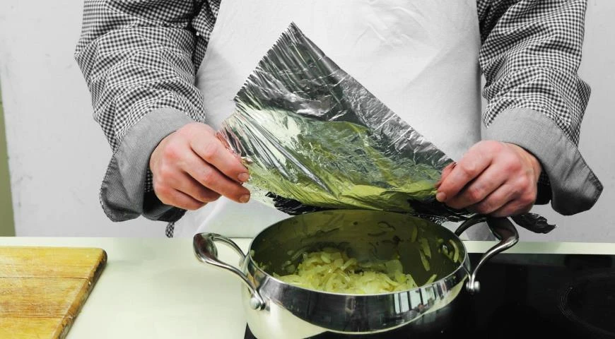 Положите целые зубчики чеснока на лук, закройте кастрюлю фольгой и поставьте в духовку, нагретую до 160 °С. Готовьте 1 ч, пару раз перемешав лук за это время.