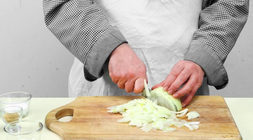 Разогрейте духовку до 160 °С. Очистите лук для постного супа и нарежьте, лучше тонкими полукольцами или четвертинками колец. Очистите зубчики чеснока.