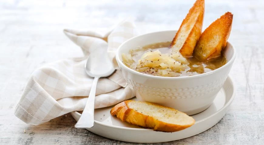 Постный луковый суп можно посыпать мелко рубленой зеленью. Это могут быть родные нашим сердцам петрушка или укроп. Однако если вы хотите придерживаться традиций, не добавляйте в блюдо ничего, кроме ломтиков поджаренного багета.