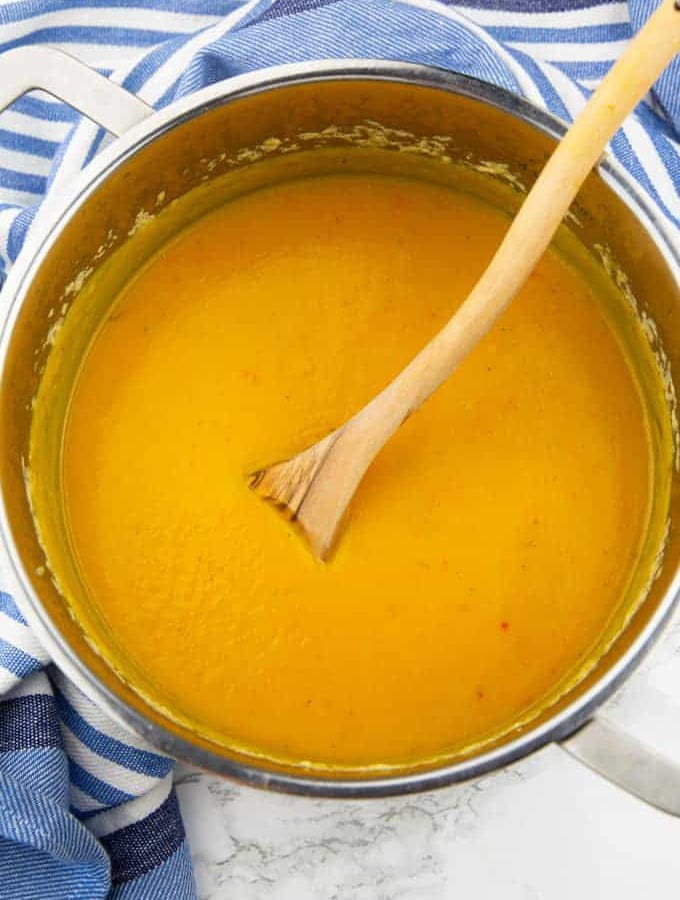 Используйте погружной блендер, чтобы пюрировать тыквенный суп, или переложите его в чашу блендера.