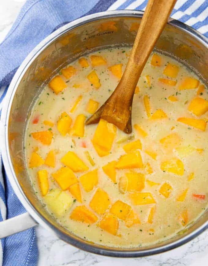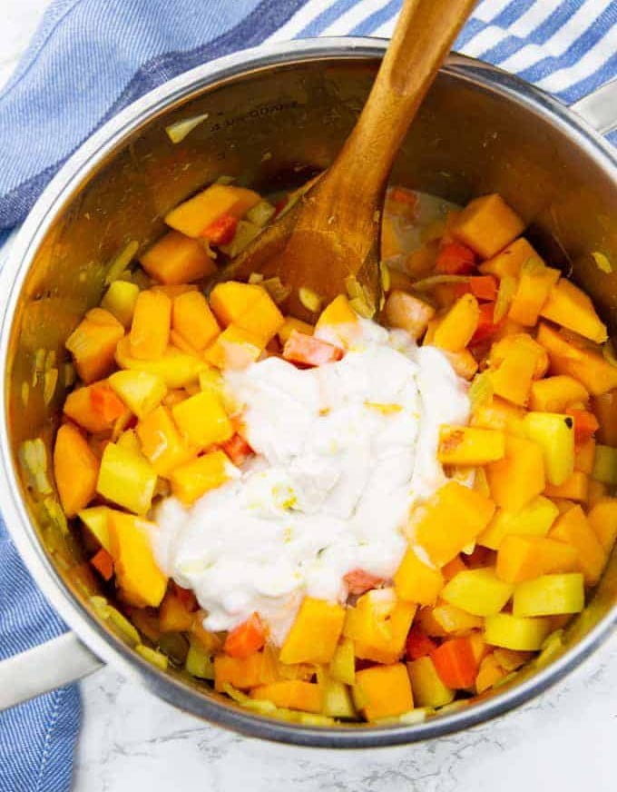 Нагрейте немного масла в большой кастрюле и обжарьте лук около 3 минут или до прозрачности. Добавьте чеснок и измельчённый имбирь и готовьте еще минуту. Затем добавьте тыкву, картофель и морковь.