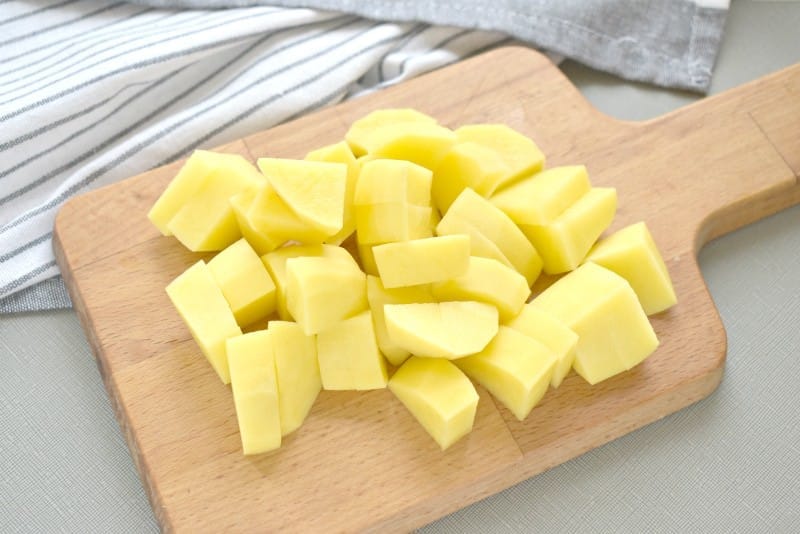 В кастрюлю наливаем воду, доводим её до кипения и по вкусу солим. Очищаем картошку, нарезаем средними кубиками, отправляем в кипящую воду. После закипания варим 5 минут.