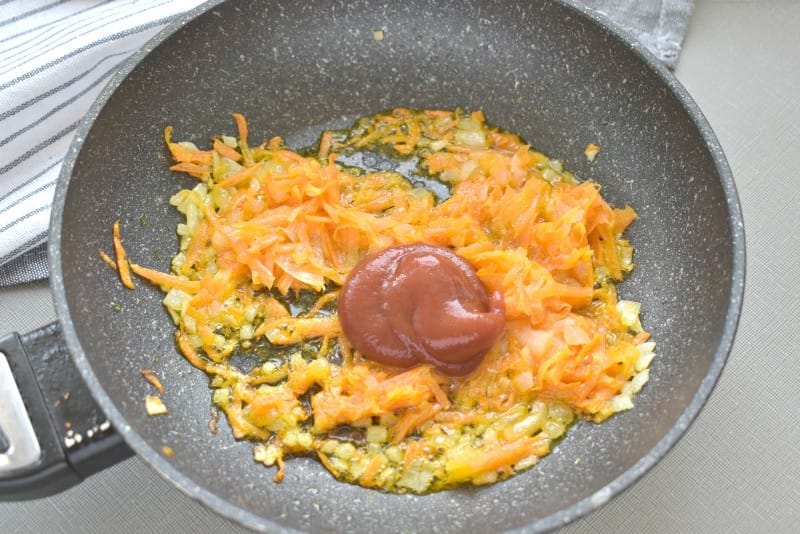 Добавляем затем к луку и моркови томатный соус, перемешиваем, тушим пару минут.
