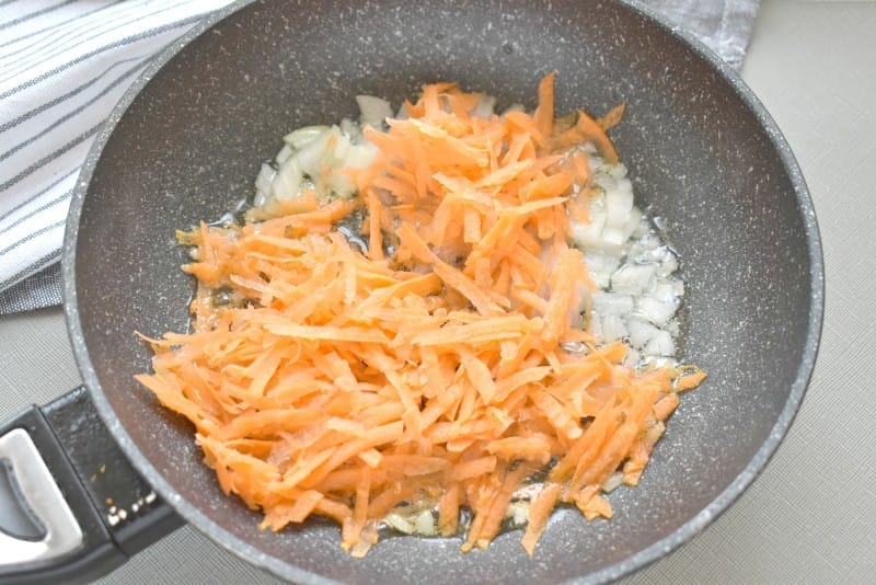 Лук нарезаем маленькими кусочками, а морковь натираем. Нарезку из овощей выкладываем в сковороду в разогретое растительное масло. При периодическом перемешивании обжариваем овощи 5-7 минут.