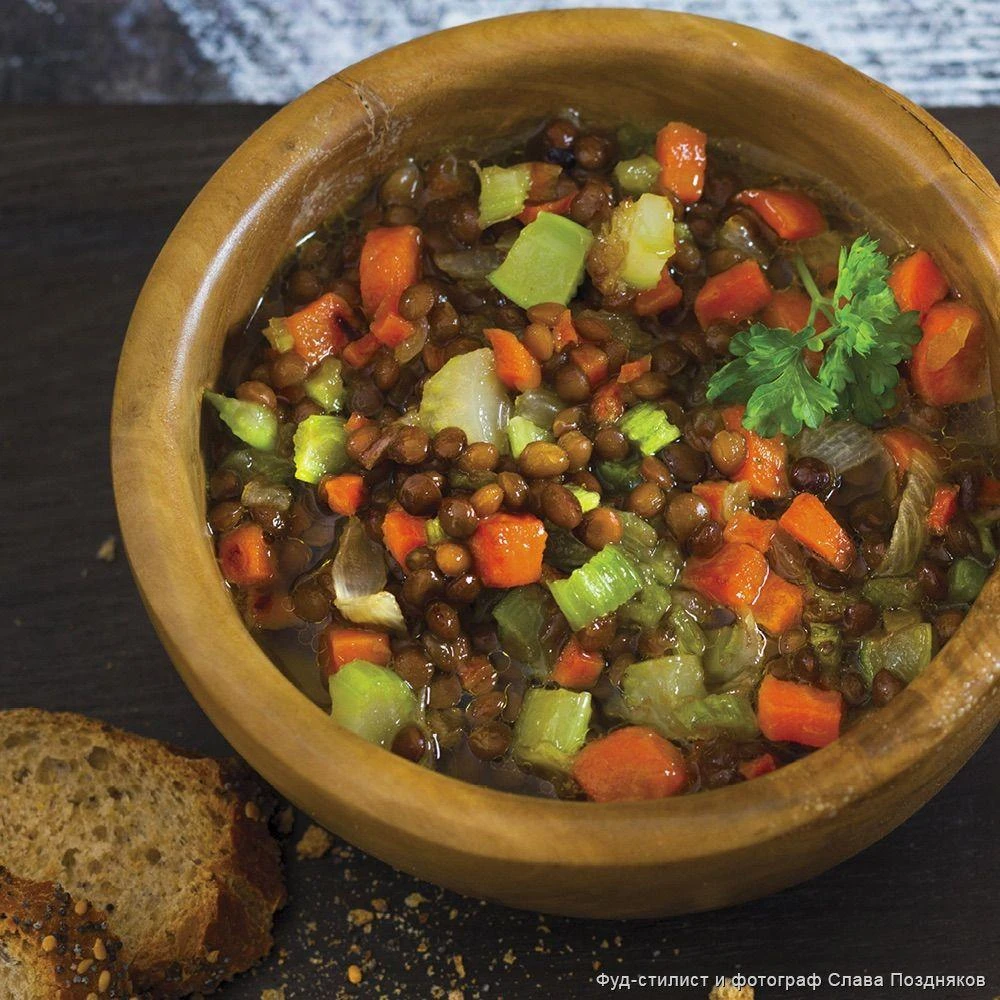 - Добавьте чечевицу и обжаривайте еще 3-5 минут.