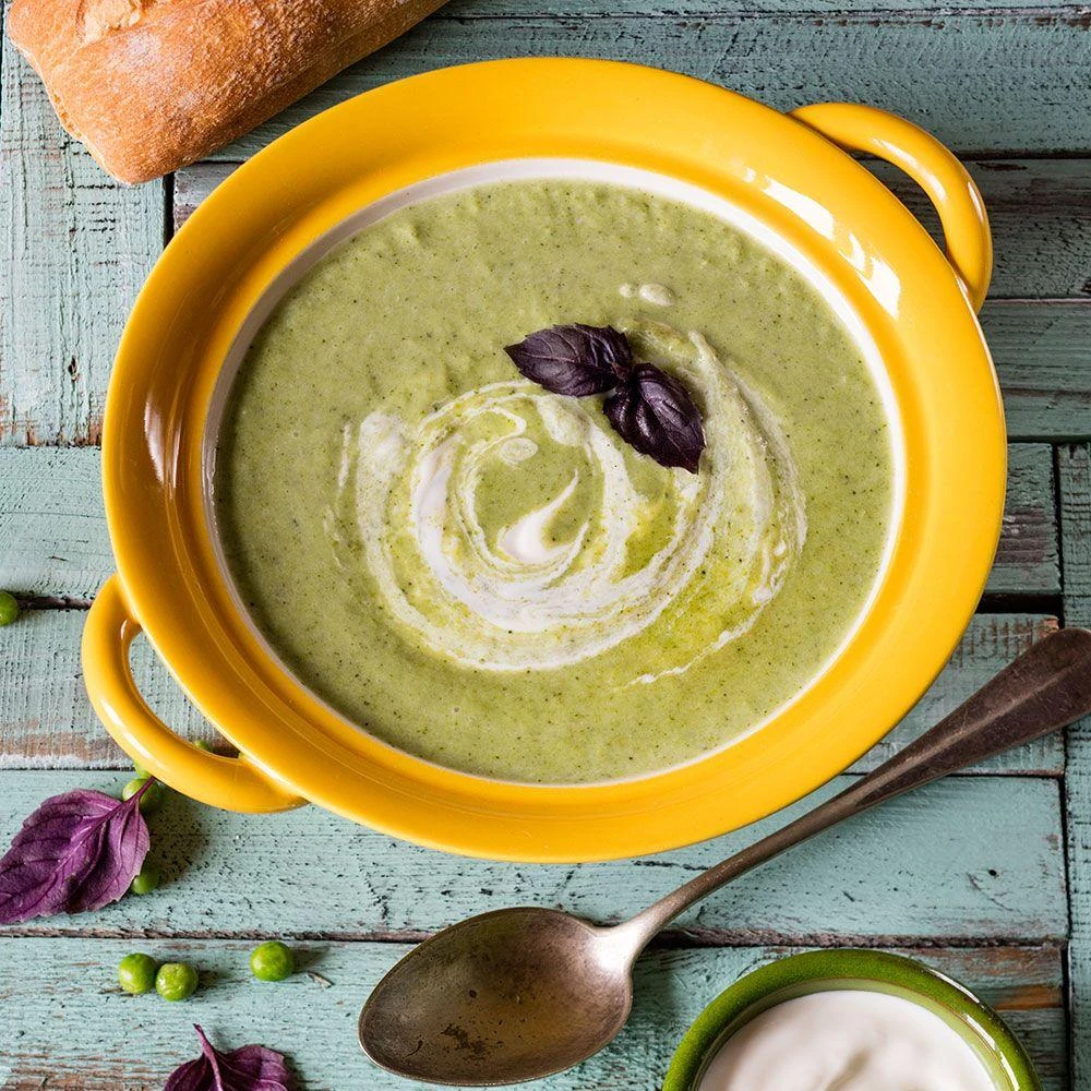 Суп-пюре из брокколи и горошка, с базиликом и сметаной