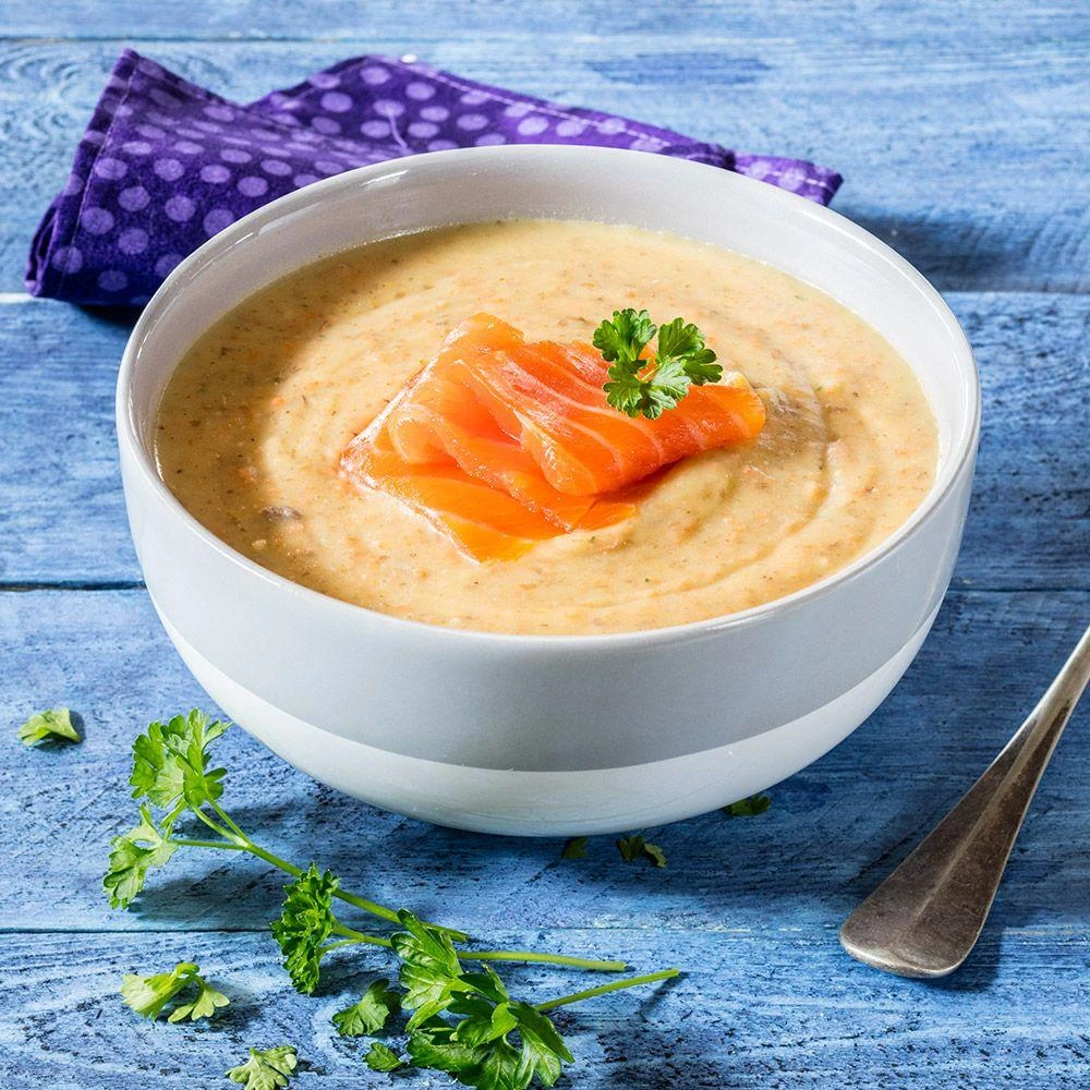 - Верните суп в кастрюлю, посолите, поперчите, прогрейте.