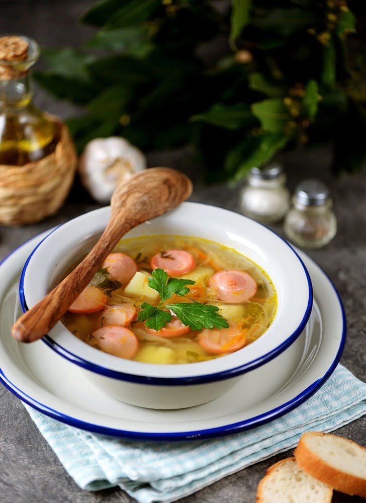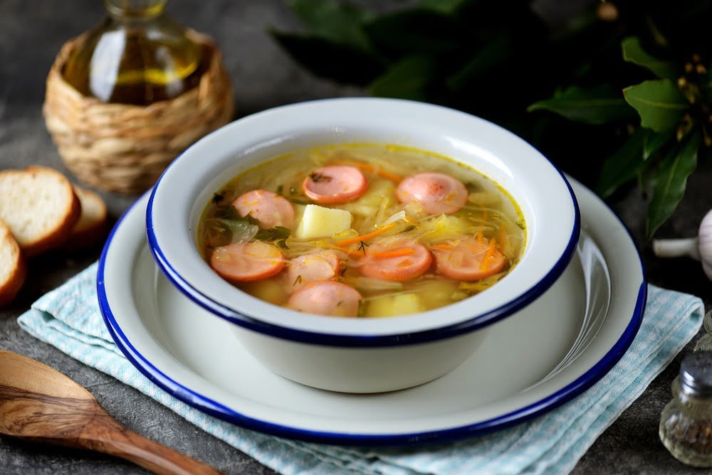 Из простых продуктов можно приготовить очень вкусное блюдо. Если у вас в холодильнике есть капуста, картофель и несколько штук сосисок, можно приготовить очень вкусный и сытный суп, практически диетический, такой суп имеет минимум калорий.