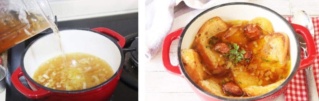 Возвращаем лук в кастрюльку и добавляем бульон. Приправляем специями. Готовим суп две-три минуты, добавляем кусочки жареной колбаски и поджаренный хлеб и даем ему поготовиться еще две-три минуты. Подаем такую вкуснятину сразу, . Приятного аппетита!