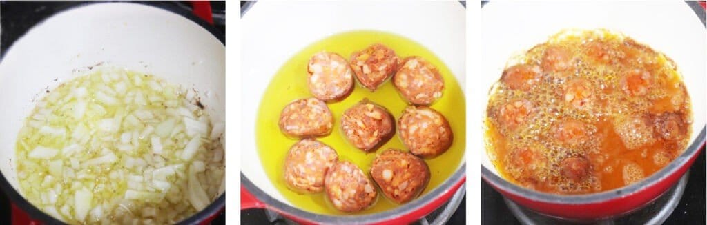 Почистите и меленько нарежьте лук и обжарьте его на оливковом/растительном масле. Снимите, когда он станет прозрачным. В том же масле обжарьте нарезанную ломтиками колбаску.