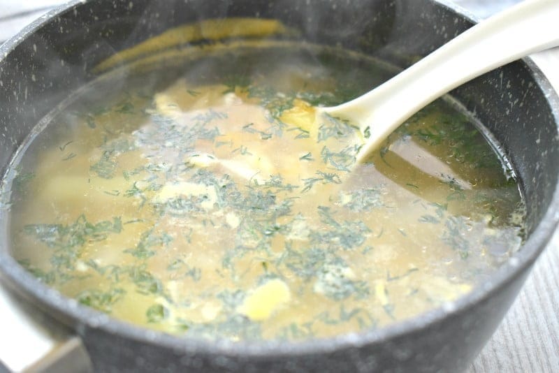 В конце приготовления суп по вкусу перчим и добавляем зелень, перемешиваем. Через минуту выключаем огонь.