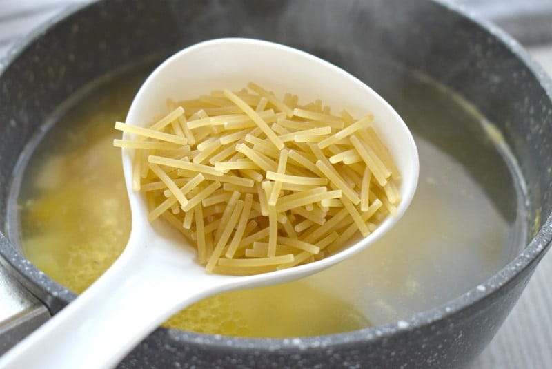 Когда картошка с морковкой проварятся 20 минут, добавляем в суп вермишель, перемешиваем. Варим 3-5 минут.