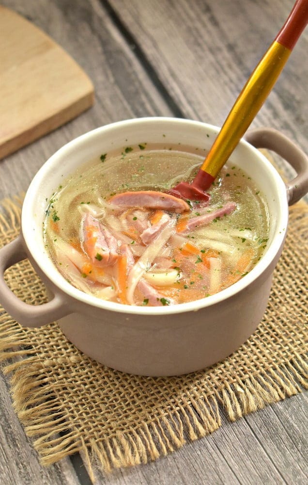 Вместо картофеля в этом супе используется лапша, которая делает блюдо не только вкусным, но и более легким. В сочетании с ветчиной и морковкой, этот суп становится настоящей находкой для любителей вкусной и полезной еды. Я готовила суп на курином бульоне, но можно и просто на воде. Суп с ветчиной и лапшой без картошки найдет своих почитателей в любой семье!