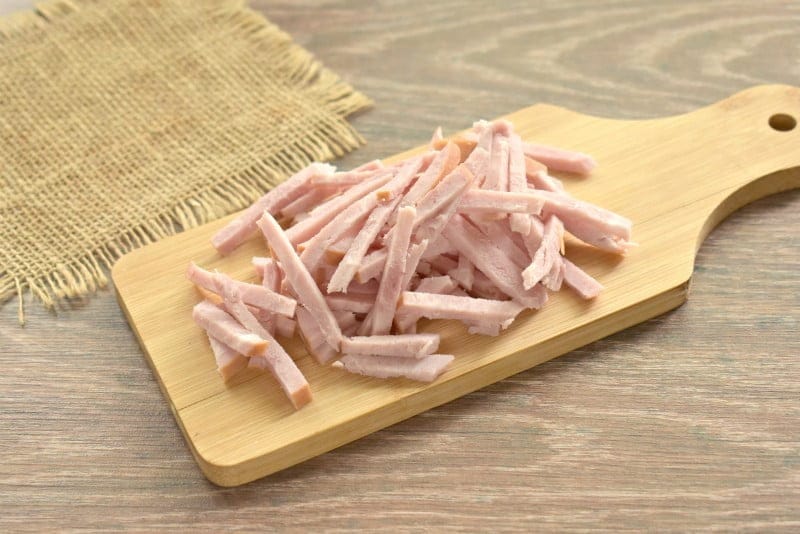 Ветчину нарезаем соломкой, переправляем в кастрюлю. Варим далее 2-3 минуты.