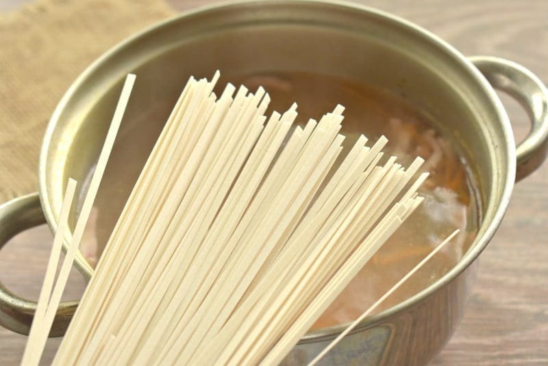 Теперь отправляем в суп тонкую лапшу. Сразу перемешиваем, продолжаем варить 3 минуты (или, как указано на упаковке производителя).