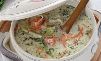 Влить вино, готовить 2 мин., затем залить овощи горячей водой. Довести до кипения, снять пену и убавить огонь. Варить 30 мин.