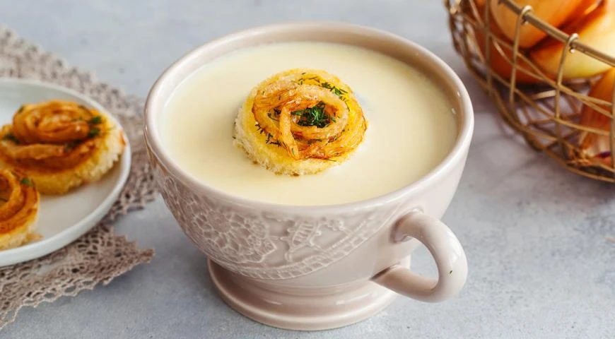 Из хлеба вырезать кружки диаметром и обжарить на сливочном масле. Оставшуюся луковицу нарезать кольцами, обвалять в муке и жарить на оливковом масле до хруста. На каждый гренок положить обжаренный лук, посыпать укропом. Суп разлить по тарелкам, сверху выложить гренки и подавать.