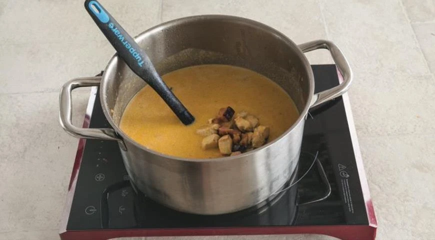 - Порциями добавляйте тертый сыр, все время размешивая суп. Когда весь сыр расплавится, влейте вустерский соус, верните в кастрюлю курицу и грудинку. Приправьте солью, кайенским и черным перцем. Варите 5 мин.