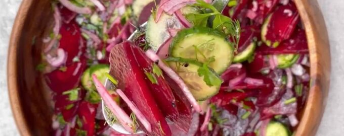Ингредиенты Свекла некрупная — 2-3 шт. Огурец свежий — 2 небольших Микс салатных листьев — горсть Укроп, петрушка —