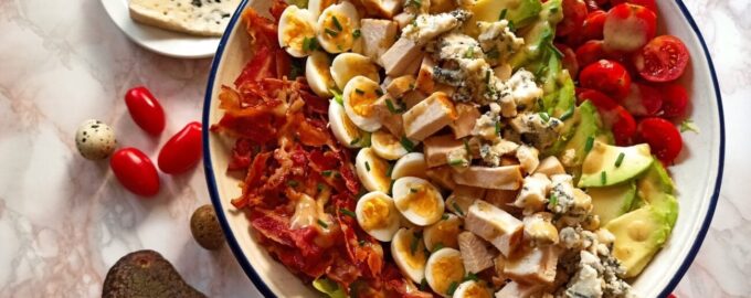 Ингредиенты Нарезанная кубиками куриная грудка — 200г Бекон нарезанный — 8 полосок Авокадо — 1 Салат ромэн — пучок Перепелиное