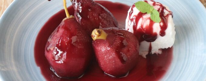 Ингредиенты Груша — 3 шт. Красное вино — 350 мл Лимонное мороженое — шарик (по желанию) Мята — для украшения Корица —