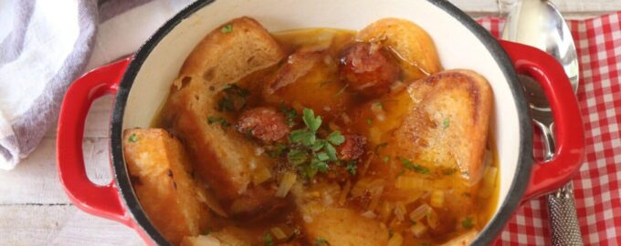 Ингредиенты Колбаса чоризо — 100 гр Буханка хлеба — 4 ломтика Бульон — 500 мл Лук репчатый — 1/2 головки Оливковое масло —