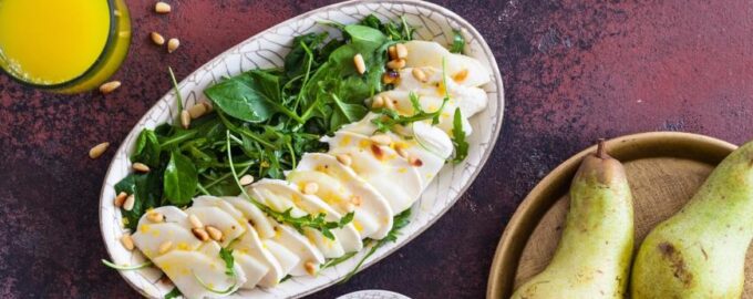 Cалат с грушами, моцареллой и кедровыми орехами — приглядимся к этому блюду повнимательнее. Мы привыкли подавать моцареллу с помидорами, а с грушами