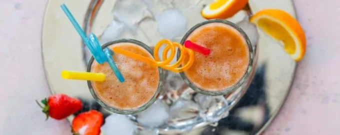 Смузи из банана, апельсинов и клубники — один из многочисленных вариаций этого популярного густого напитка, который завоевал надежные позиции в меню ресторанов