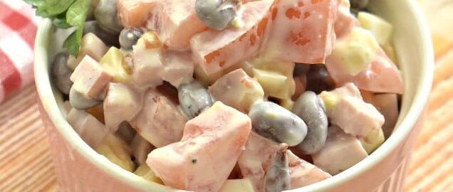 Ингредиенты фасоль красная — 200 гр ветчина — 150 гр сыр — 80 гр помидор крупный — 1 шт. яйцо — 2 шт. майонез —