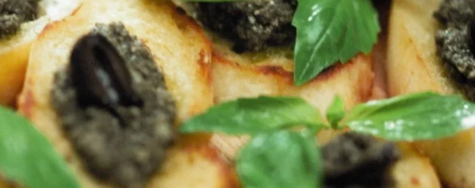 Маслины с успехом можно заменить на оливки. Ингредиенты Маслины без косточки Bonduelle 1 банка (300 г) Багет 8 ломтиков Чеснок 1 зубчик Базилик несколько