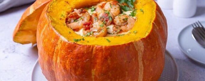 Ингредиенты Тыква — 1шт Креветки — 500гр Бекон — 50гр Сыр моцарелла — 250гр Голландский сыр — 200гр Брынза —