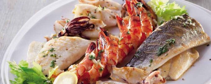 1 порция 30 — 60 минут Ингредиенты Филе камбалы 200 г Филе сибаса 200 г Креветки 200 г Мини — кальмары 200 г Оливковое масло 30 мл Соль...