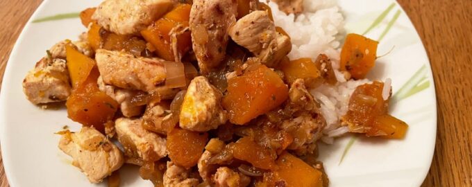Ингредиенты Куриное филе — 500-600 гр Тыква — 300 гр Лук репчатый — 1 шт. Имбирь свежий — 30 гр Приправа овощная —