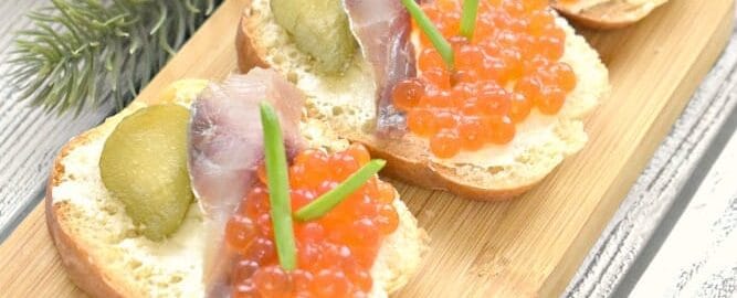Ингредиенты багет/хлеб/батон — 200 гр масло сливочное — 70 гр огурец солёный — 1 шт. филе сельди — 100 гр икра красная — 50 г зелень — для...