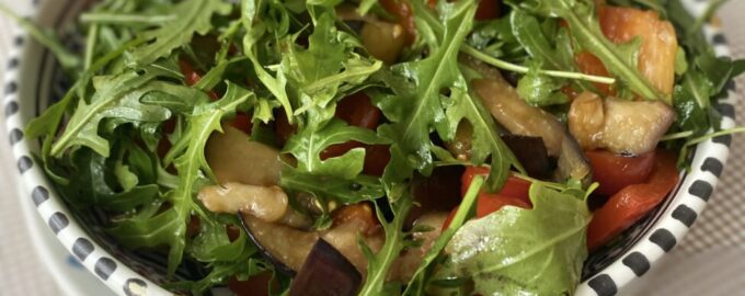 Ингредиенты Баклажан — 1 шт. Перец болгарский — 1 шт. Черри — 1 ветка Руккола — 1 горсть Соус соевый — 1-2 ст.ложки Соль —