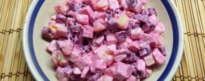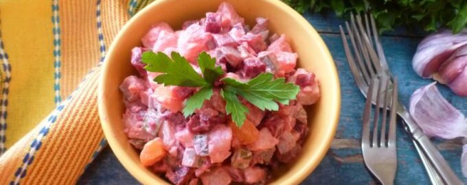 По составу этот салат похож на венигрет, но по вкусу совсем не он. В моём салате полезные осенние овощи заправляются майонезом и добавляется немного чеснока.