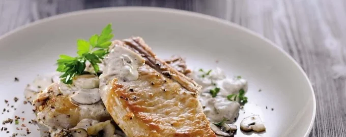 Ингредиенты Свиная корейка на ребре 500 г Оливковое масло 15 мл Соль 2 г Перец 5 г Шампиньоны 100 г Сливки (38%) 300 мл Сливочное масло 25 г...