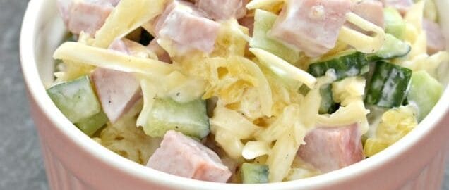 Ингредиенты ананас консервированный — 100 гр ветчина — 100 гр огурец свежий — 1 шт. сыр — 100 гр майонез легкий —