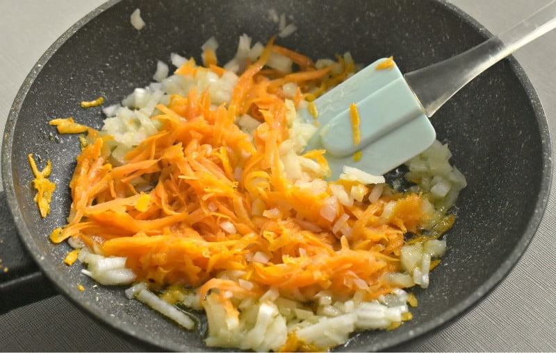 Для рецепта нужно заранее отварить рис. Рис перекладываем в холодную воду, доводим до кипения и варим 15 минут. Очищаем лук и морковь, лук нарезаем кусочками, а морковь натираем. Овощи обжариваем растительном масле 5-7 минут, остужаем.