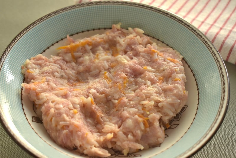 К мясному фаршу добавляем варёный рис, остуженные овощи со сковороды, разбиваем куриное яйцо. По вкусу солим и перчим. Ингредиенты между собой тщательно перемешиваем.